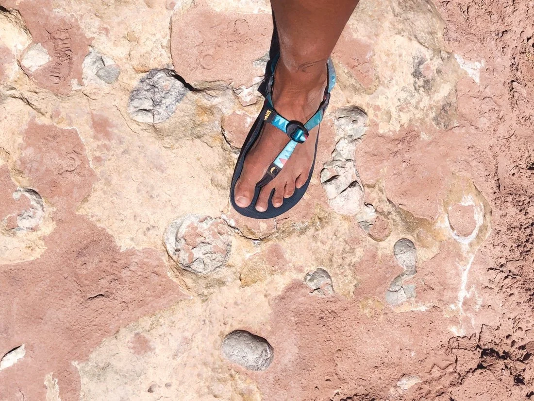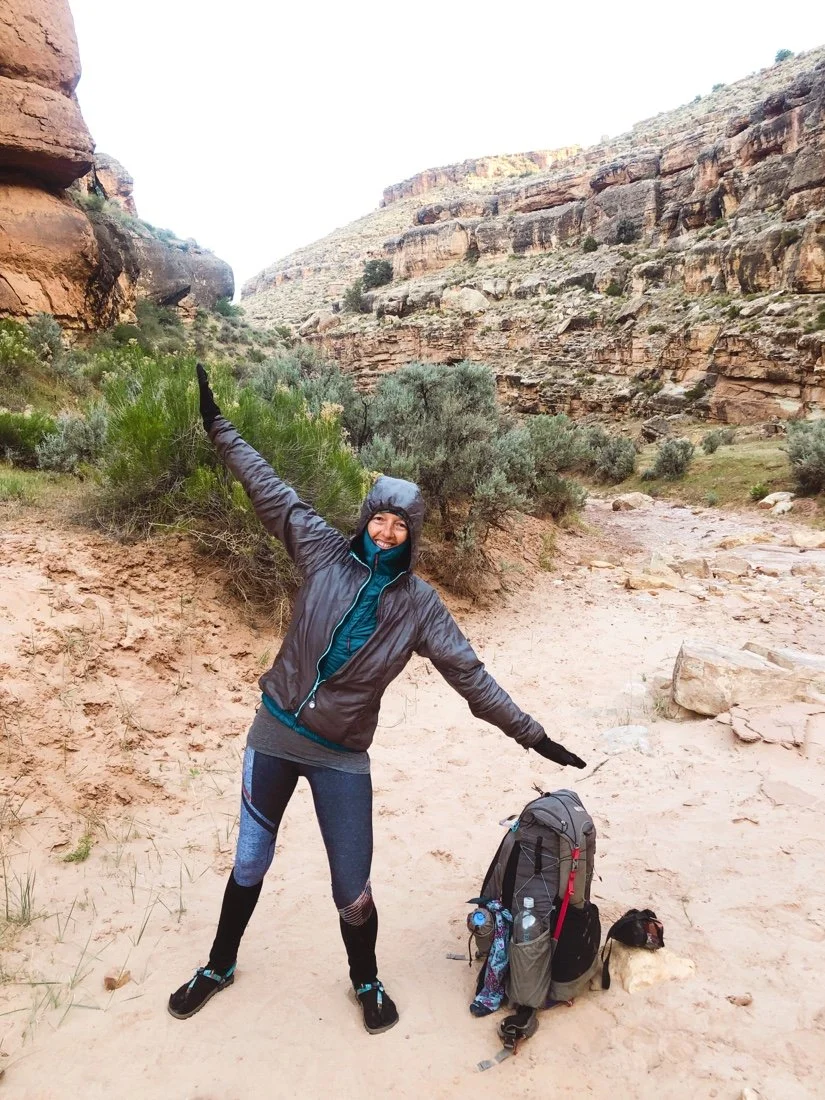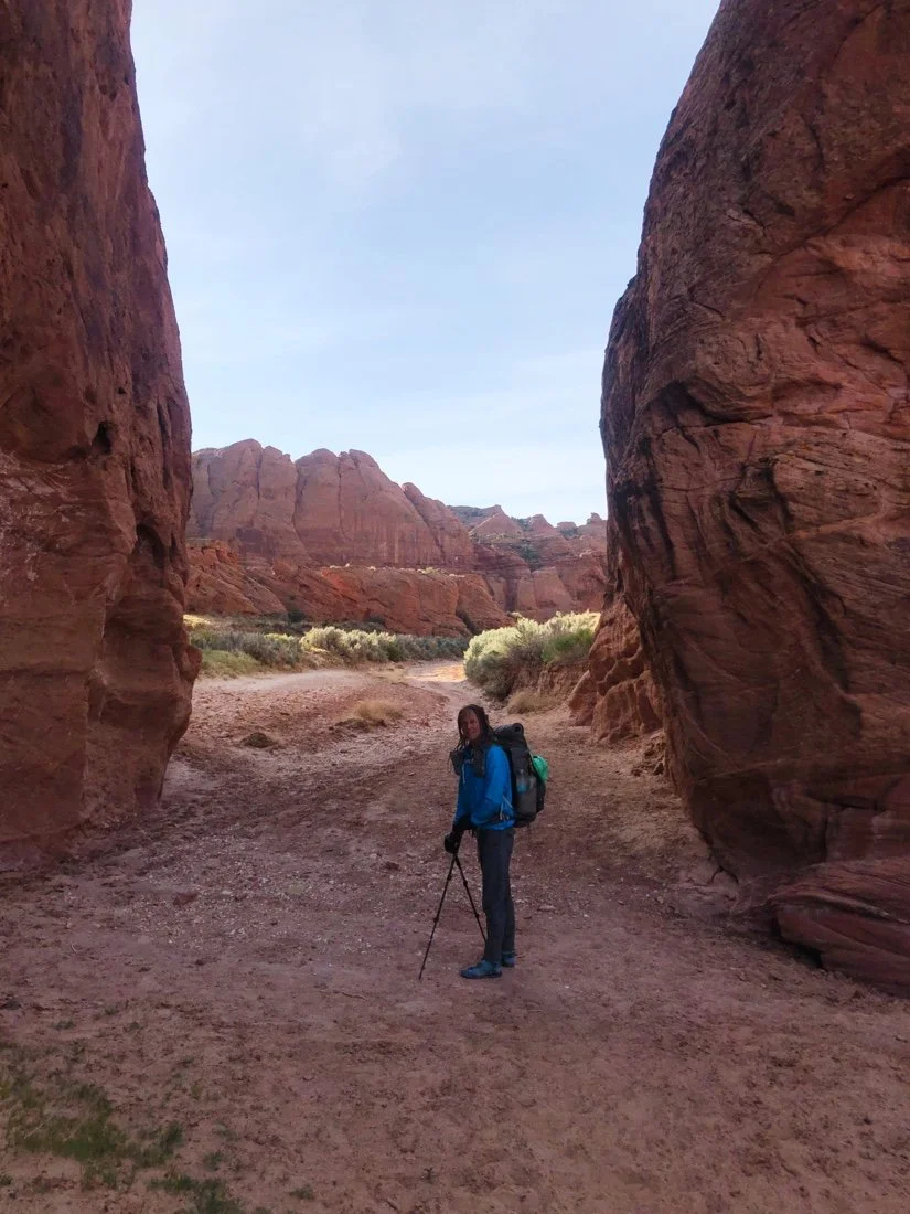 In the morning, we stop at the permit pay station at the Buckskin Gulch trailhead. The wash opens into a big meadow surrounded by smooth and wavy red rock, much different than where we had entered the gulch from the highway. After a short while the meadow narrows and the sandstone deepens into a slot canyon. These slot canyons feel like being wrapped in the arms of the earth surrounded by warm light. We exit Buckskin Gulch at Wire Pass, a very skinny exit point. And a very busy entry point for most folks, the most people we’ve seen this entire hike. It’s a bit of a shock to see so many people.