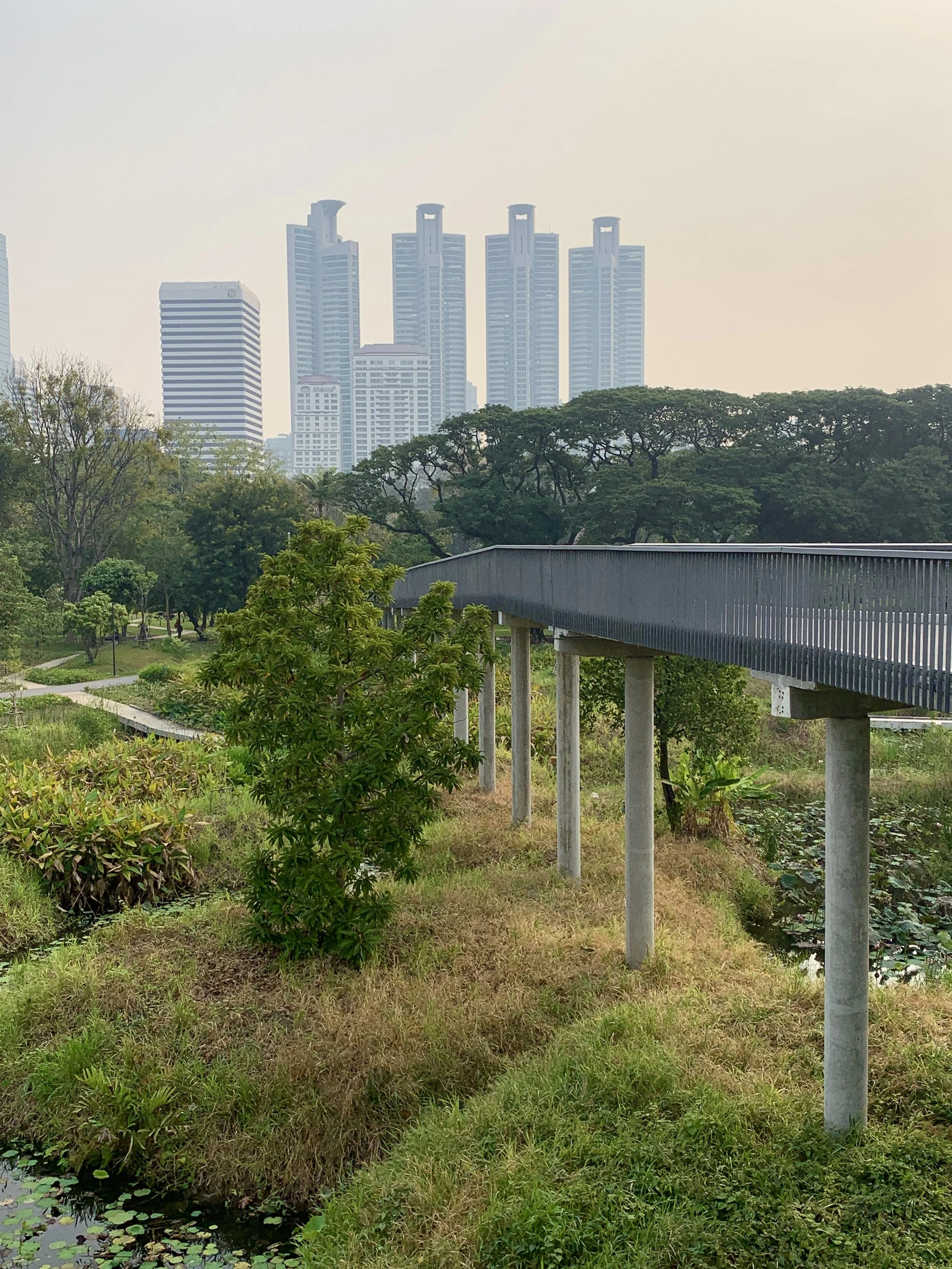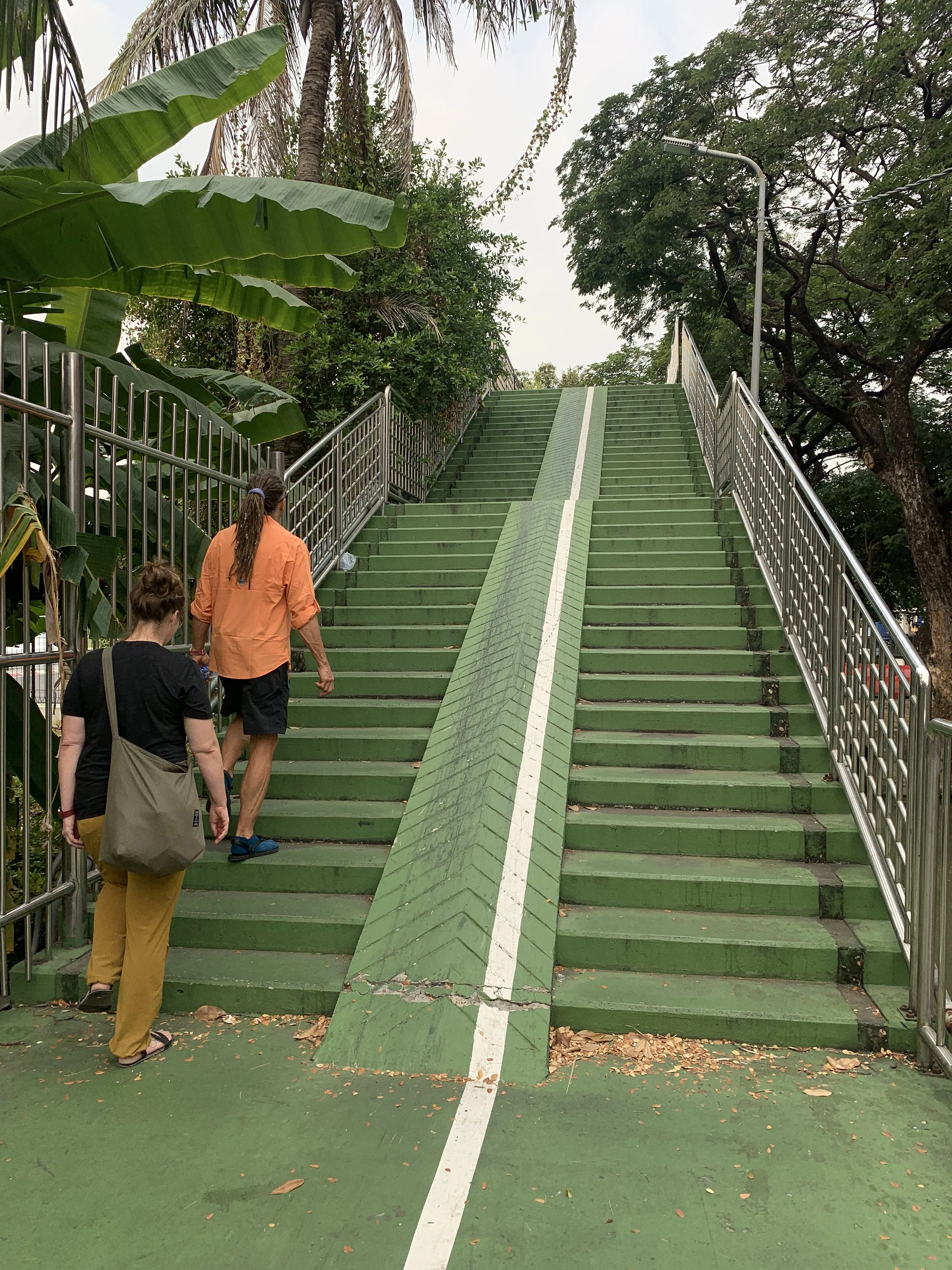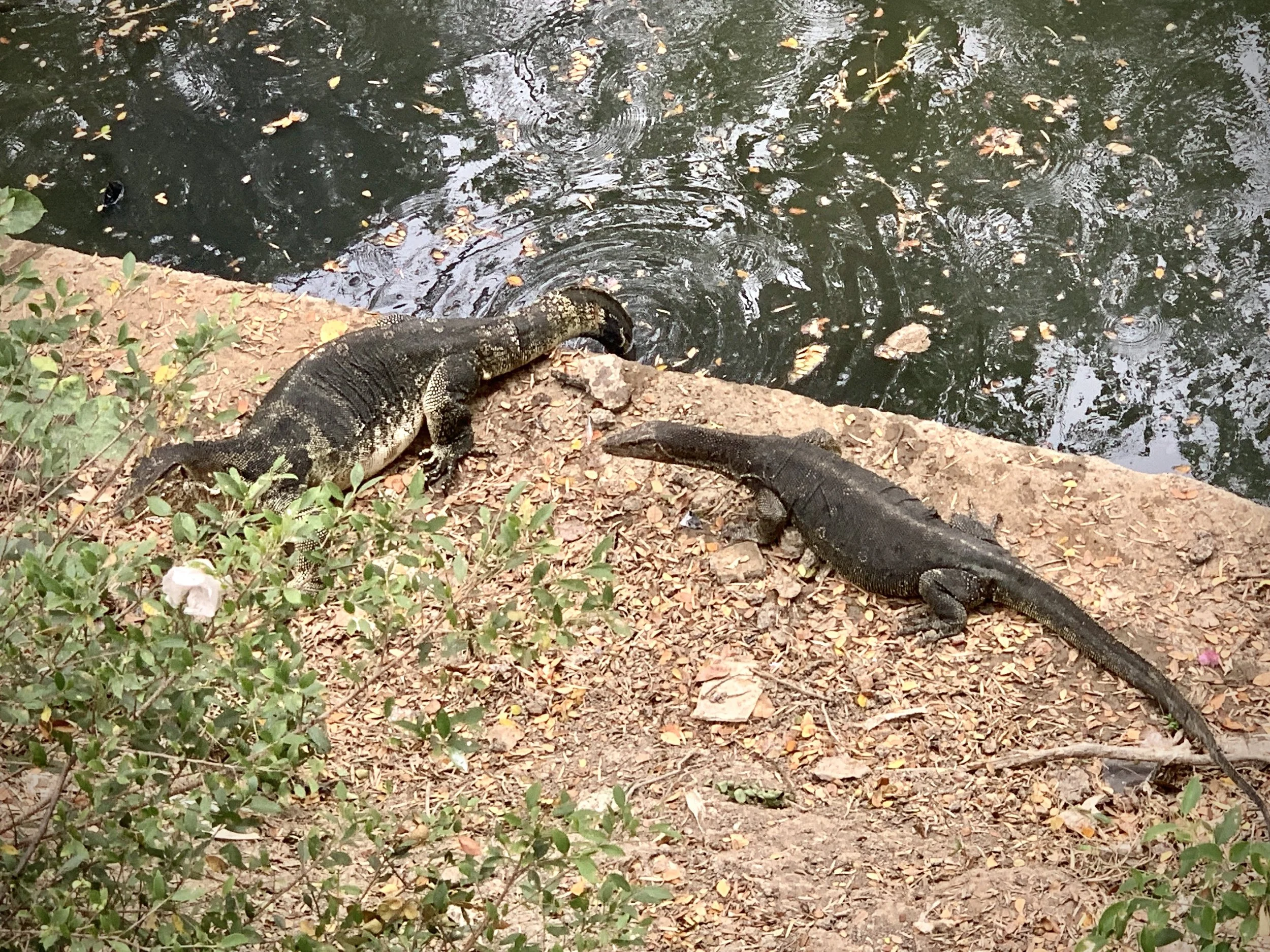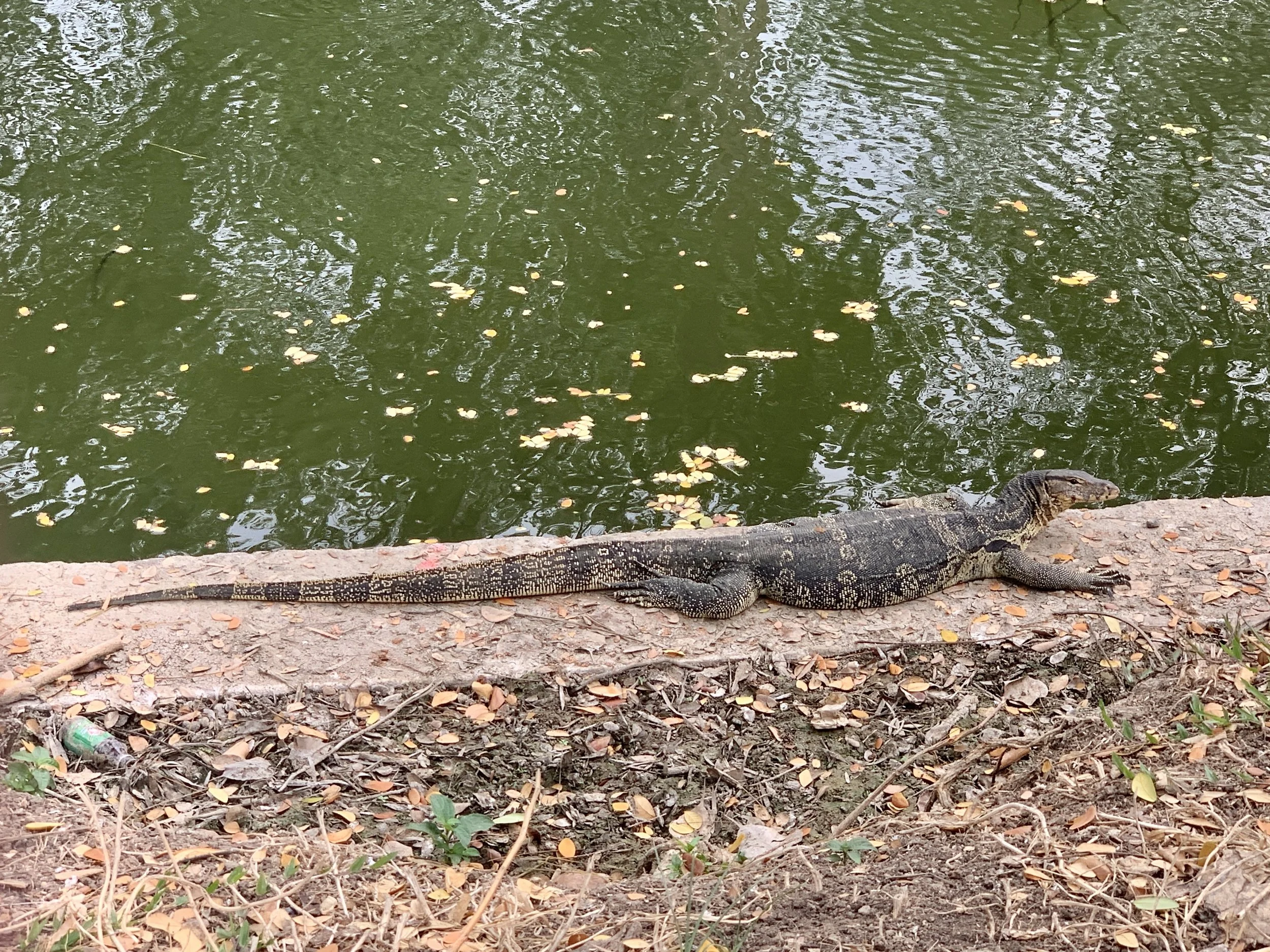 On my first night, waking at one a.m., there was a message from a fellow adventurer, Fidget, whom we had first met in Tulcan, Ecuador when she and her hiking partner were hiking north from Tierra del Fuego, and we were cycling south on the Trans Ecuador Mountain bike Trail. Our paths have crossed a few times, and by coincidence we just happened to be in Bangkok at the same time. We decided to meet up in Benchakitti Park and walk the elevated “Green Mile” over to Lumpini Park. Benchakitti park is a beautiful, more wild, park with elevated walking paths through tall trees and over small ponds, contrasted by views of shiny skyscrapers in the distance. The Green Mile is an elevated walkway that connects the two parks. And as you guessed it is about a mile in length. It passes high over the streets below and along a canal closer to Benchakitti Park, and is another place to view the contrasts from one street to the next, from old wooden houses in a neighborhood to shiny skyscrapers in the distance. Lumpini Park is more of a traditional city park with manicured paths, gazebos, and an area with food vendors. But it is also a great place to watch water monitors stretched out in the sun at the edge of a canal.