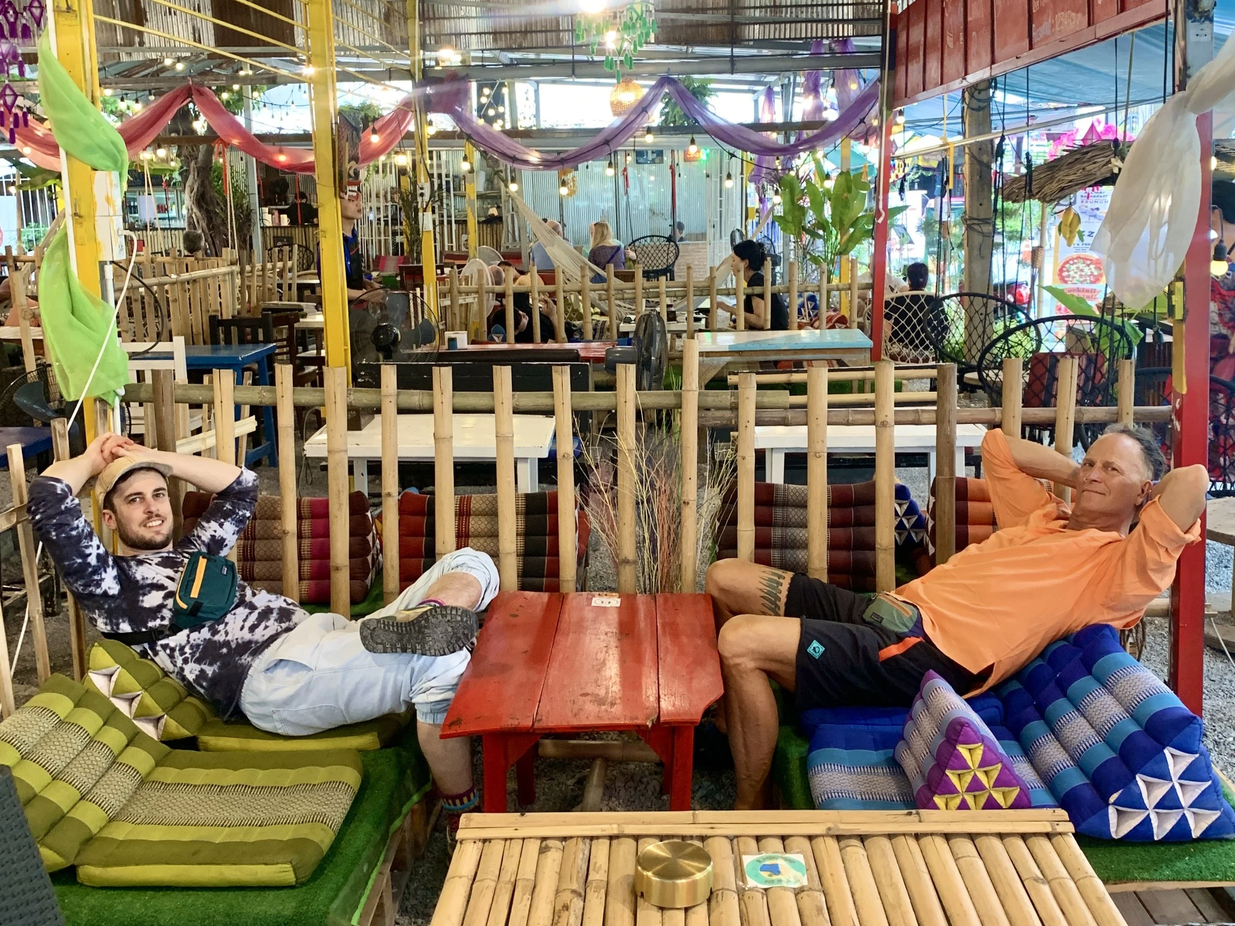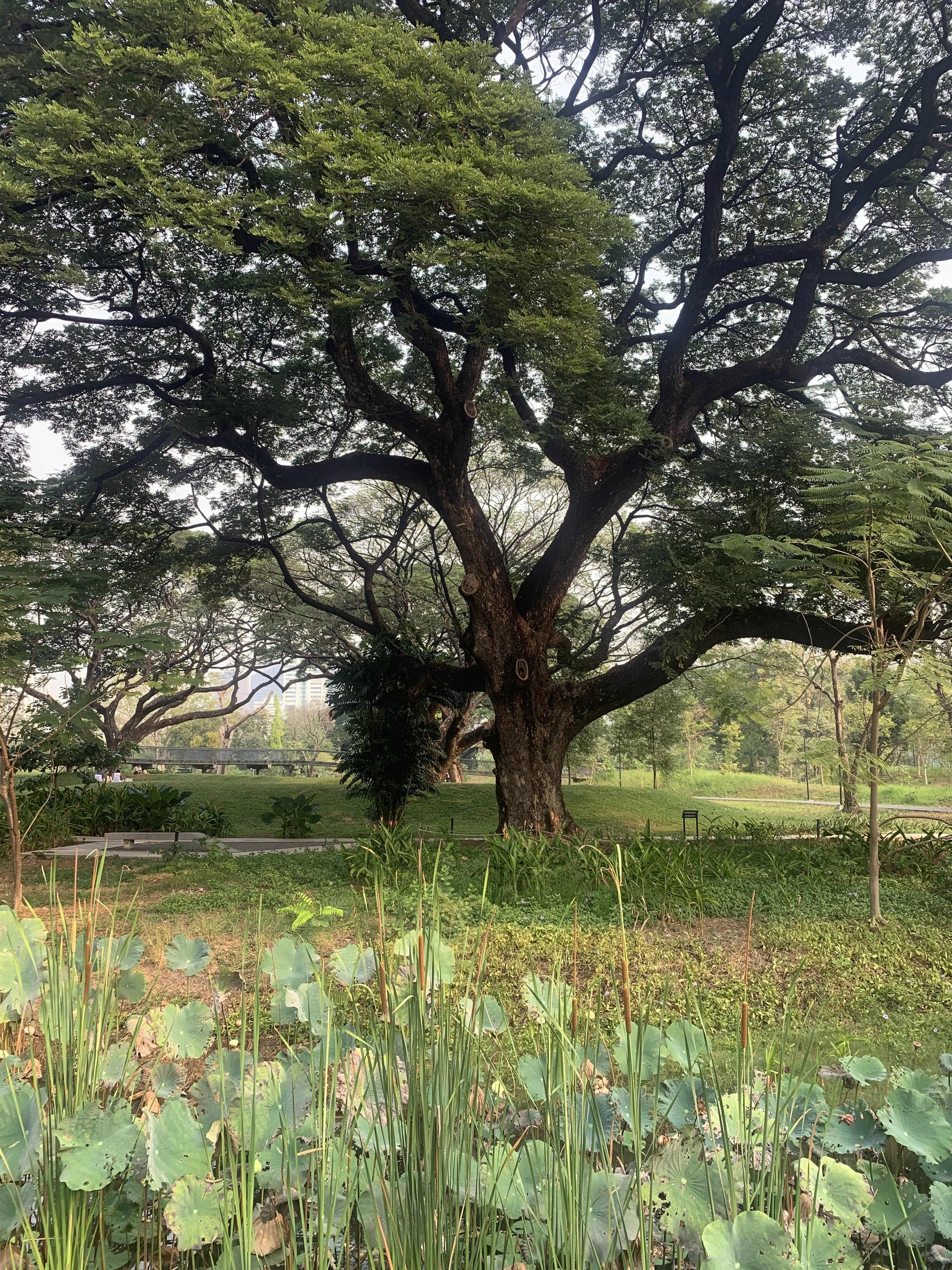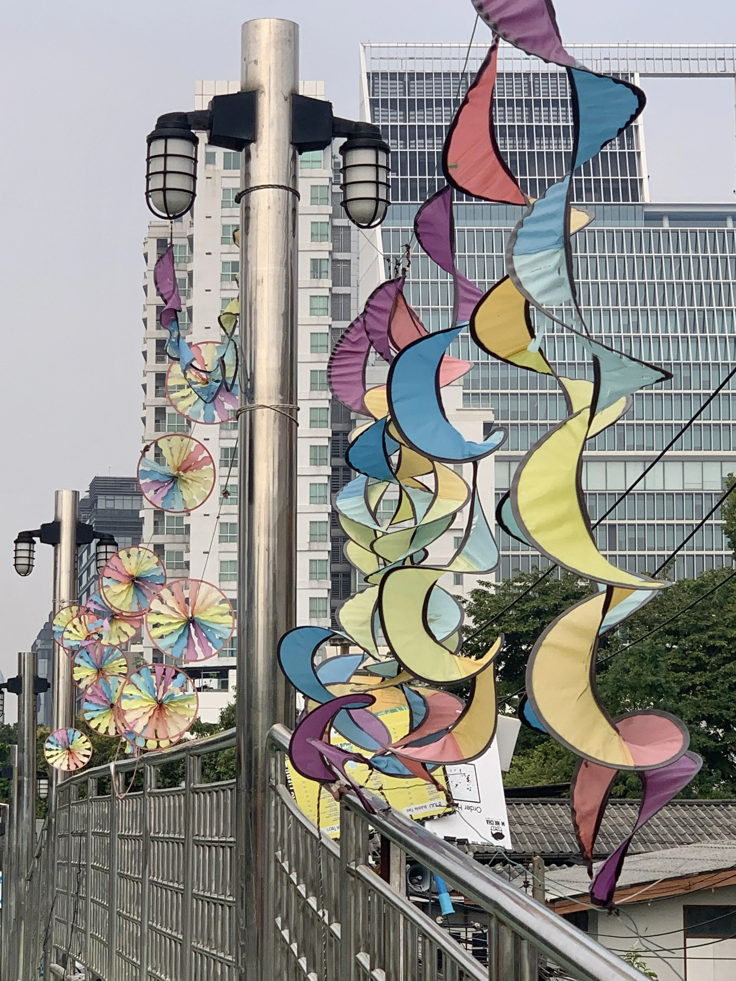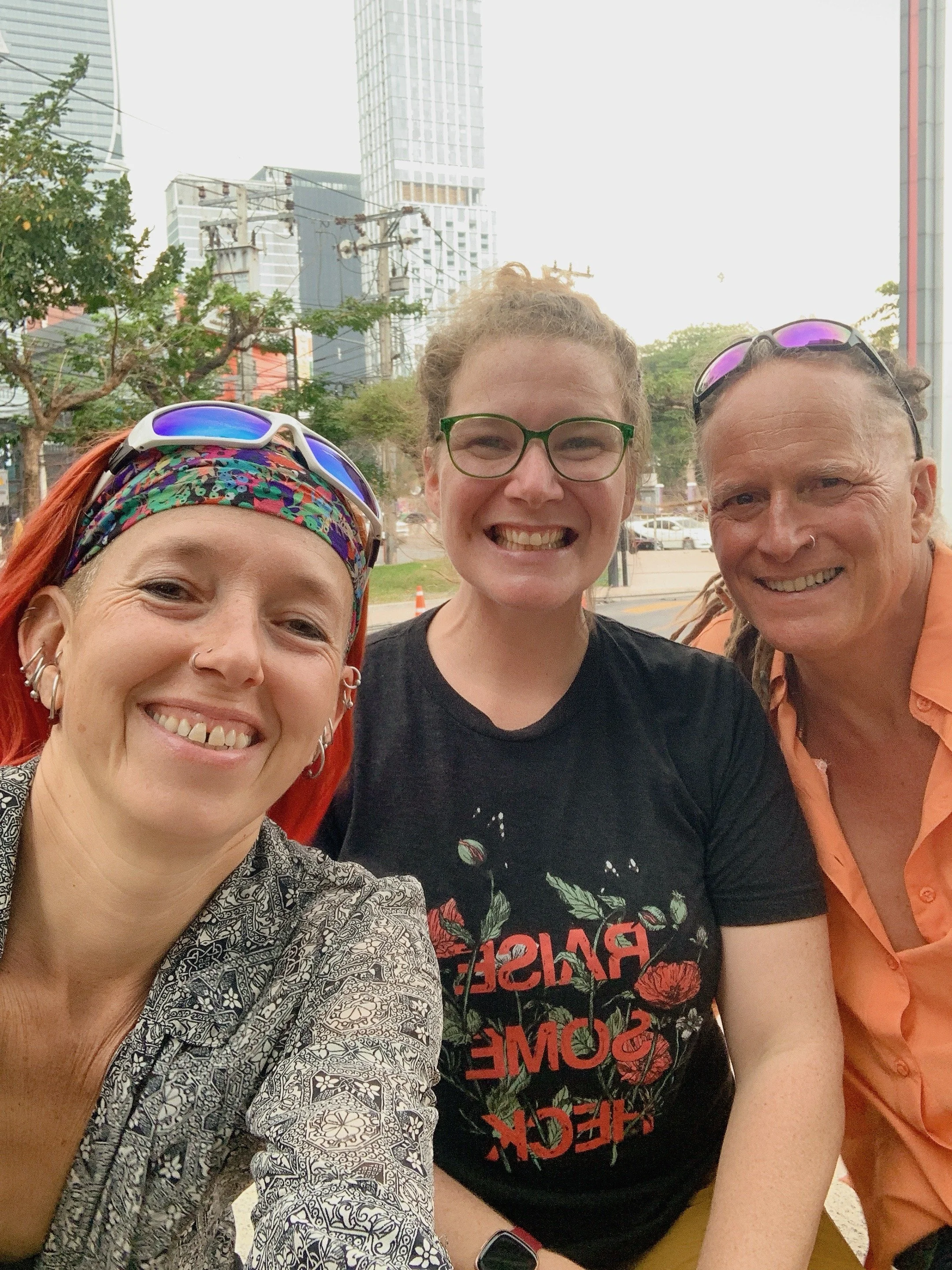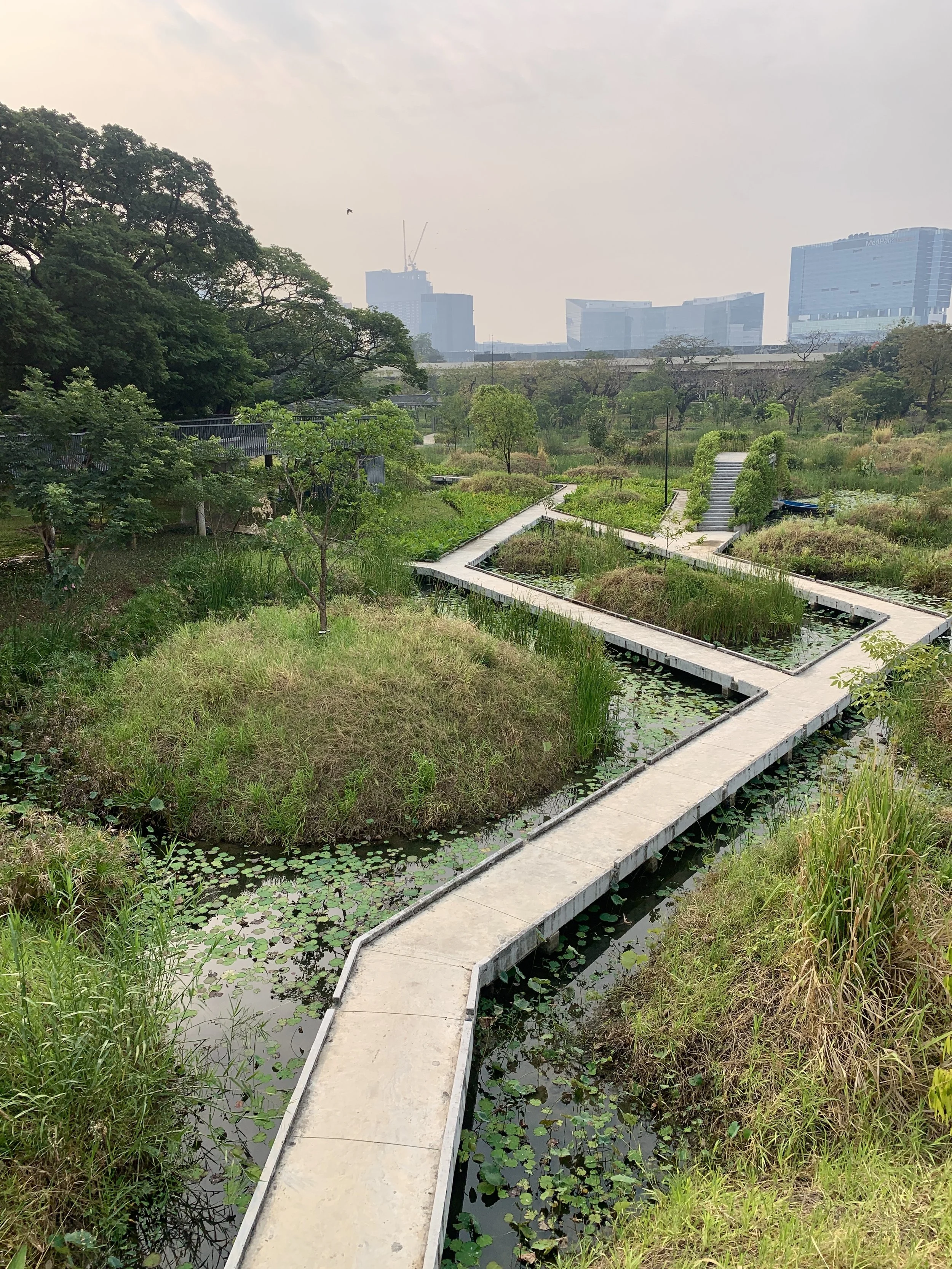 On my first night, waking at one a.m., there was a message from a fellow adventurer, Fidget, whom we had first met in Tulcan, Ecuador when she and her hiking partner were hiking north from Tierra del Fuego, and we were cycling south on the Trans Ecuador Mountain bike Trail. Our paths have crossed a few times, and by coincidence we just happened to be in Bangkok at the same time. We decided to meet up in Benchakitti Park and walk the elevated “Green Mile” over to Lumpini Park. Benchakitti park is a beautiful, more wild, park with elevated walking paths through tall trees and over small ponds, contrasted by views of shiny skyscrapers in the distance. The Green Mile is an elevated walkway that connects the two parks. And as you guessed it is about a mile in length. It passes high over the streets below and along a canal closer to Benchakitti Park, and is another place to view the contrasts from one street to the next, from old wooden houses in a neighborhood to shiny skyscrapers in the distance. Lumpini Park is more of a traditional city park with manicured paths, gazebos, and an area with food vendors. But it is also a great place to watch water monitors stretched out in the sun at the edge of a canal.