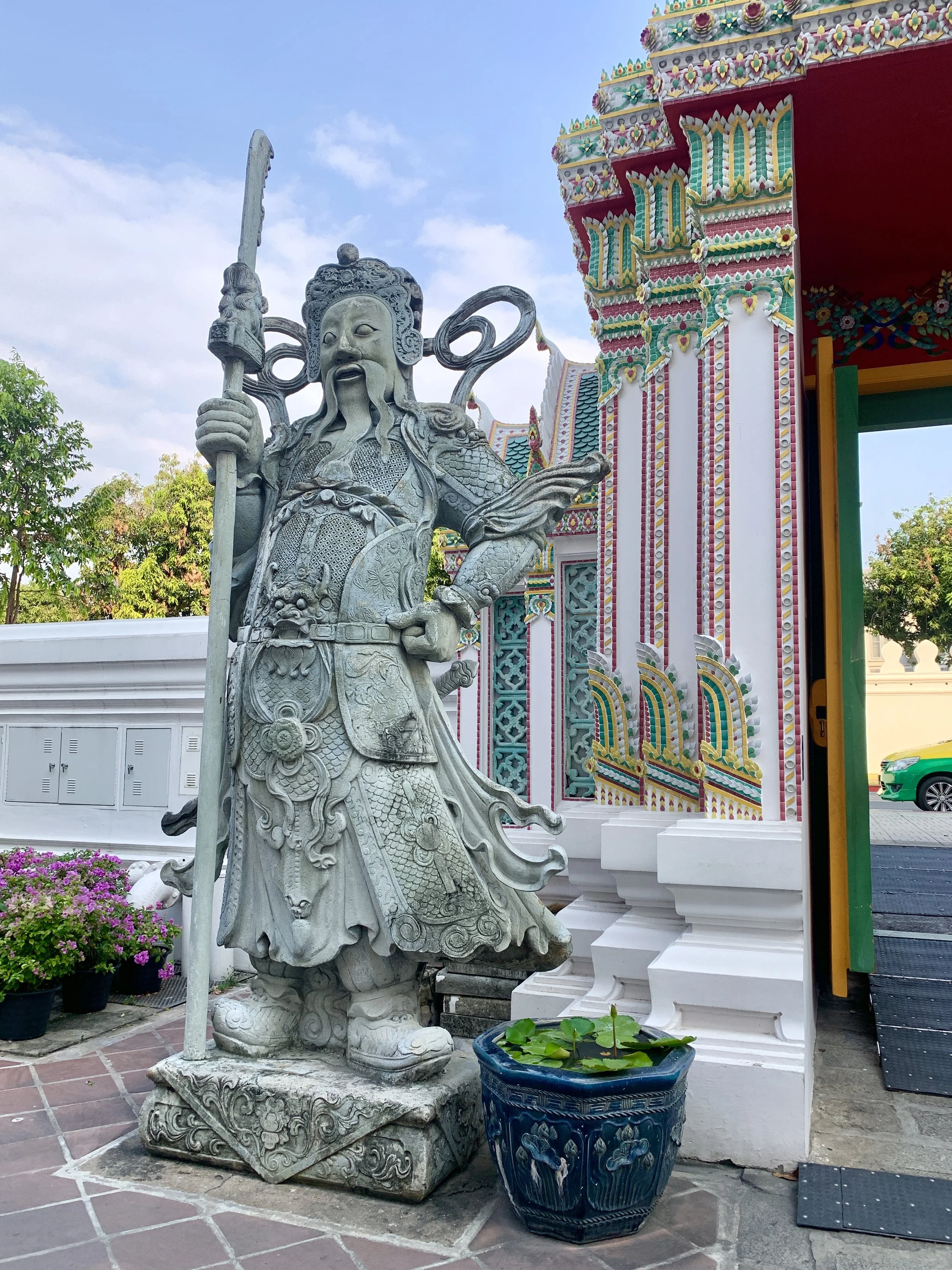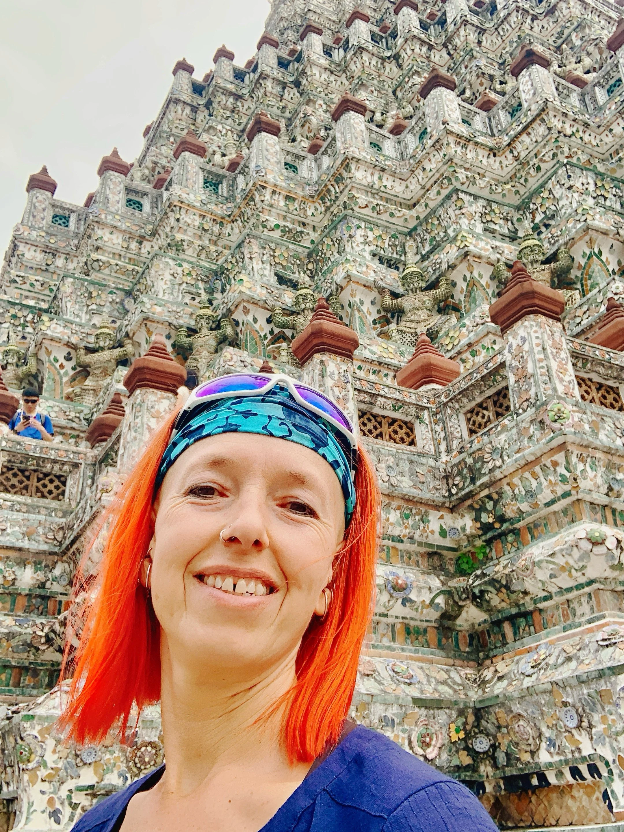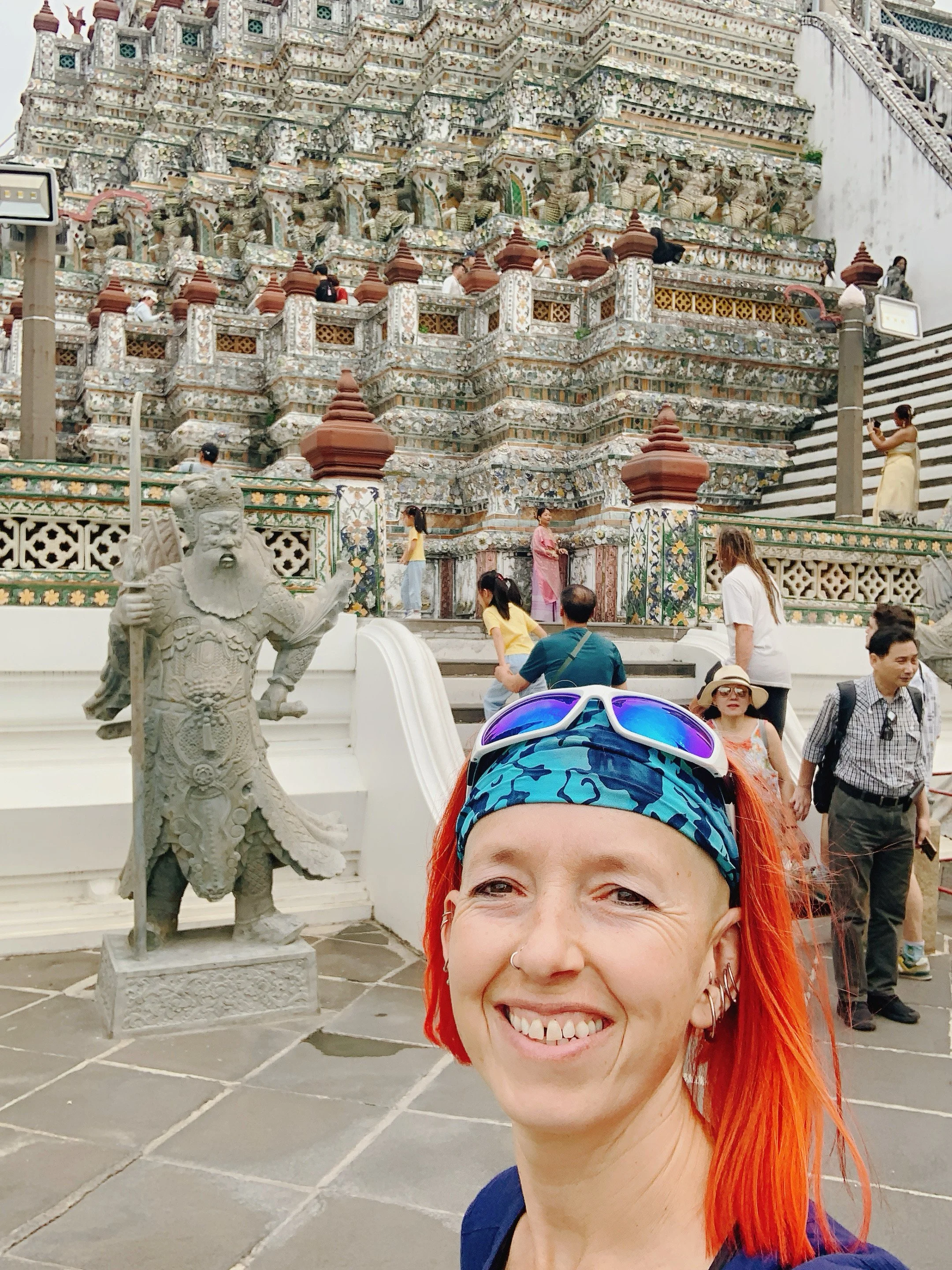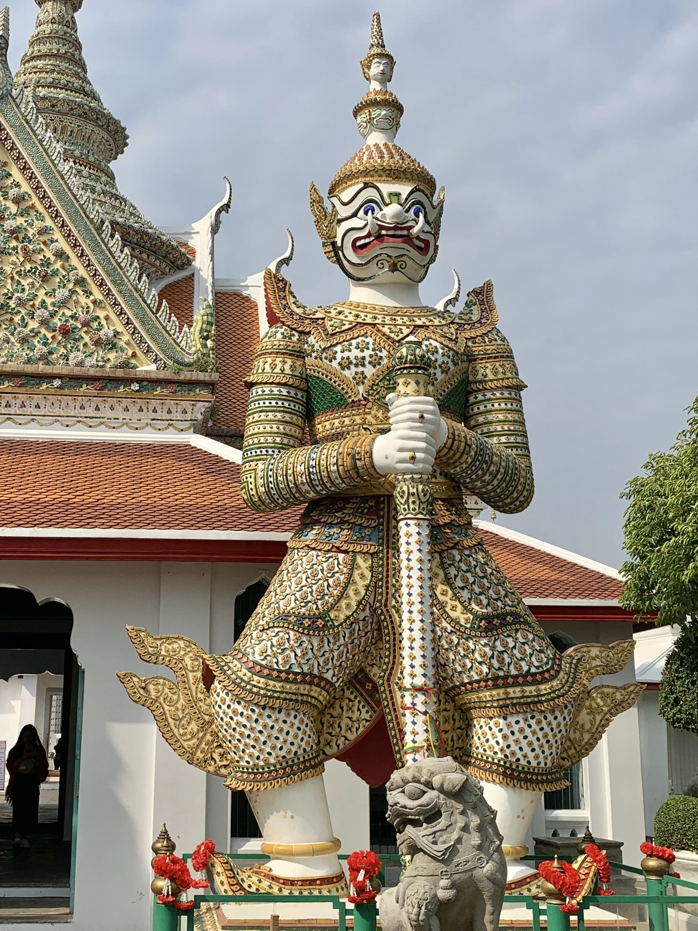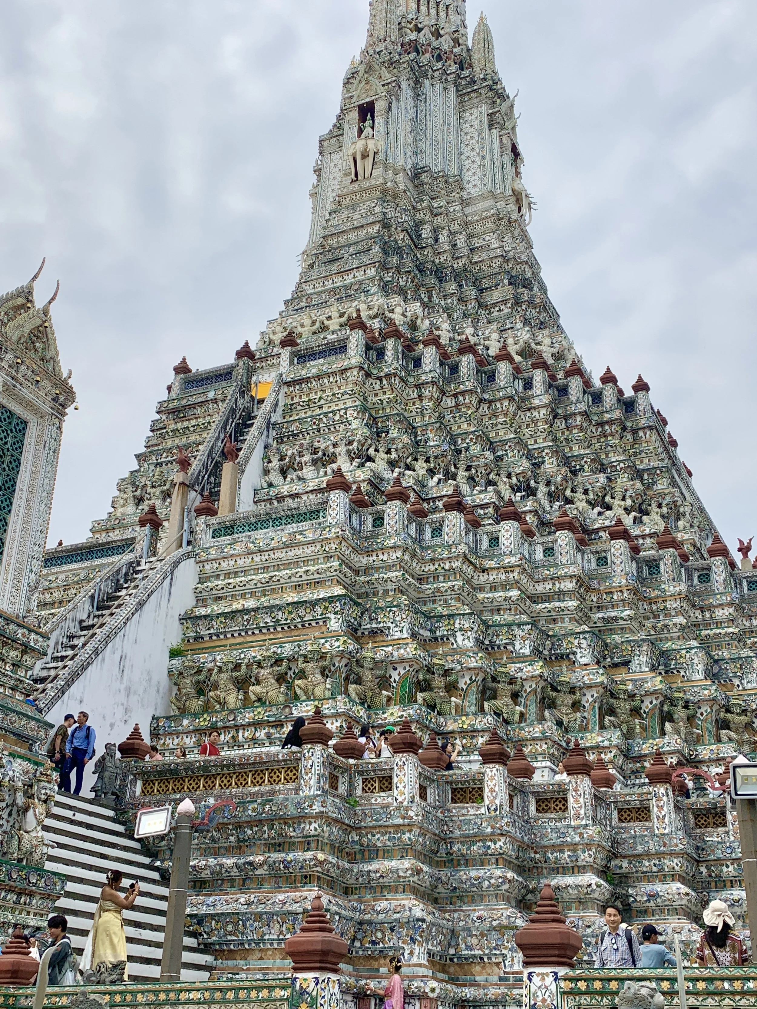 Wat Arun with its prang (spire) sits prominently on the West Bank of the Chao Phraya River, its overall shape not all too different from that of the Eiffel Tower. I can’t help but contemplate the similarities between temples, pyramids, and mountains—and the human affection for them—all spiring into the clouds in a grand erectness as if to touch the heavens. Wat Arun was my favorite temple—it is a site to behold, with its decorated facade, completely covered in carvings and tile work from its base to its spire.