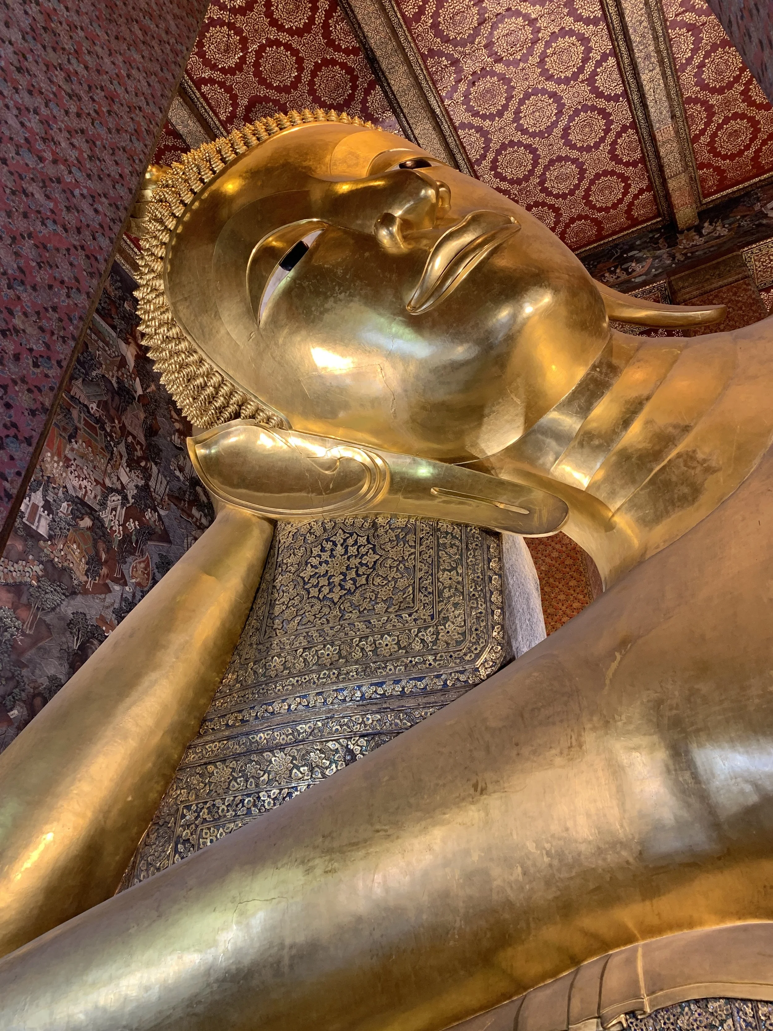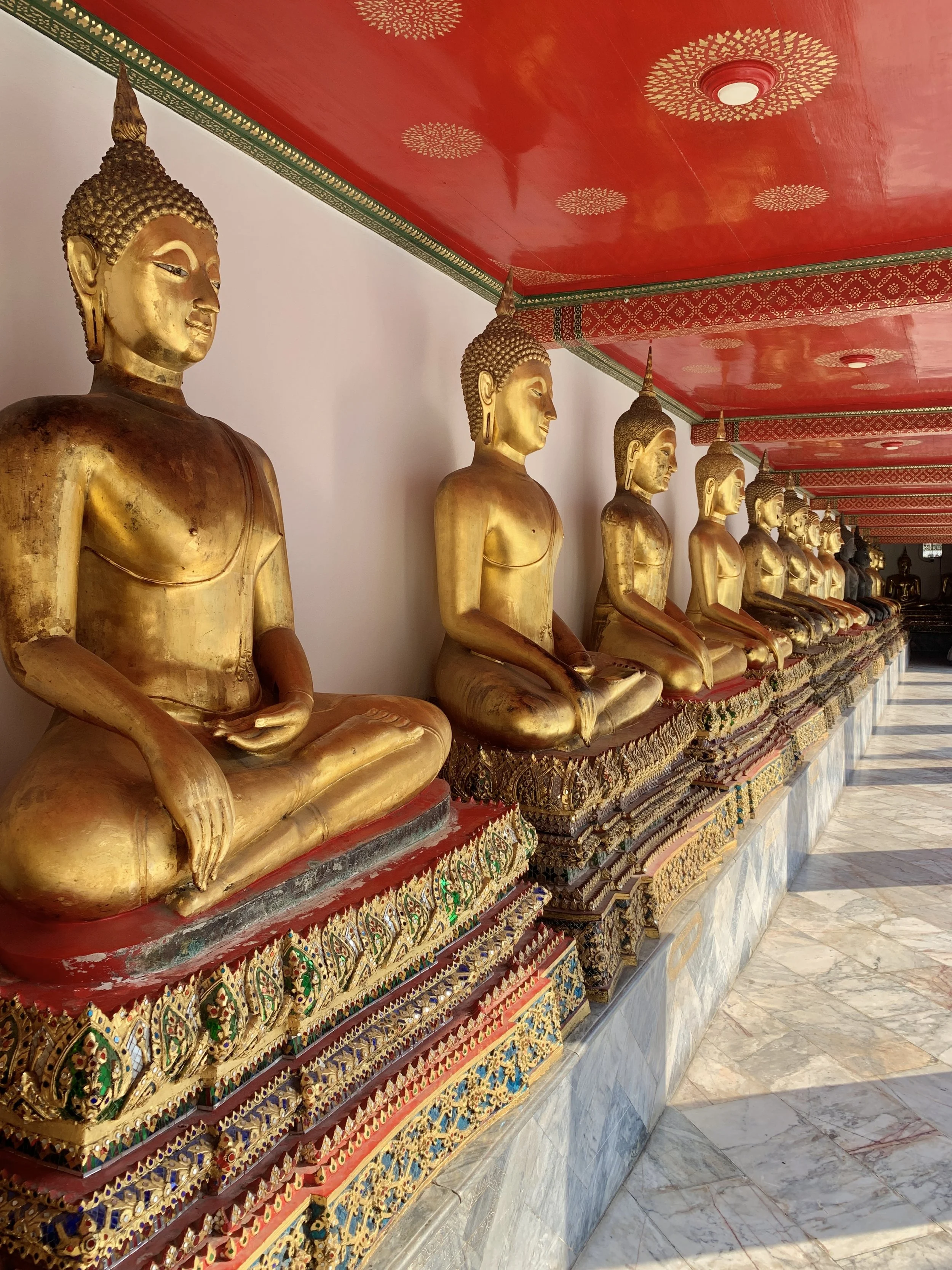 On day two we visited Wat Pho and Wat Arun and took a small ferry across the Chao Phraya River between them. For those of you that don’t know, “Wat” means “temple” in the Thai language. Wat Pho is one of Bangkok’s oldest temples thought to have been built in the late 1600’s. While once considered to be the first public university of Thailand teaching science, religion, and literature, it is now (as of 1955) a school for Thai massage and traditional Thai medicine. It is also home to the reclining buddha, one of the largest buddha statues in Thailand at 15 meters high and 46 meters long.